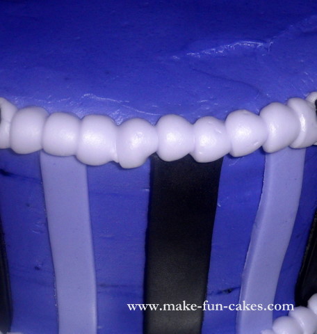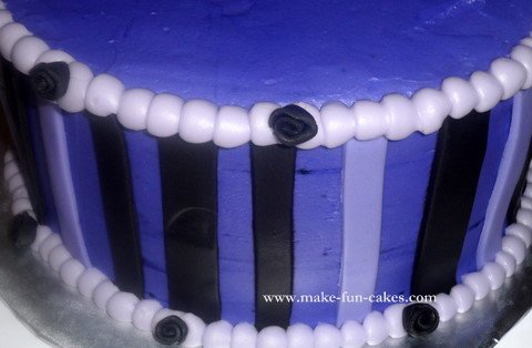 Using the 8-inch round parchment paper, decide what pattern you want to place your stripes. My pattern was 1/4-inch purple, 1/2-inch black, 1/4-inch purple, 1/4-inch black, 1/2-inch black, 1/4-inch black, repeated around the cake. It is much easier to visualize this with a picture.